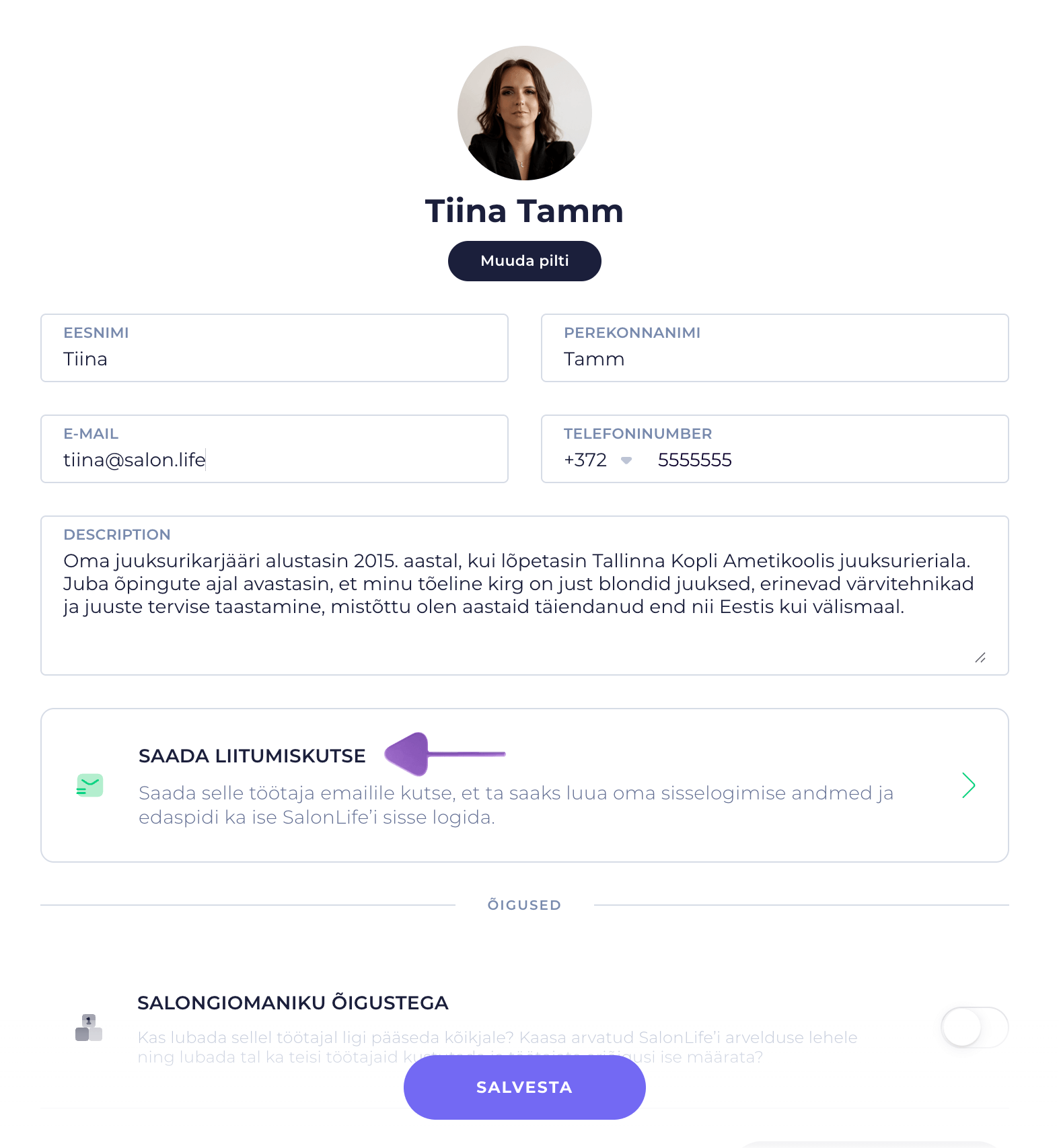 Salongi omanik vÔi administraator saab alati Töötajate lehe kaudu veenduda, kas uus töötaja on kutse vastu vÔtnud.