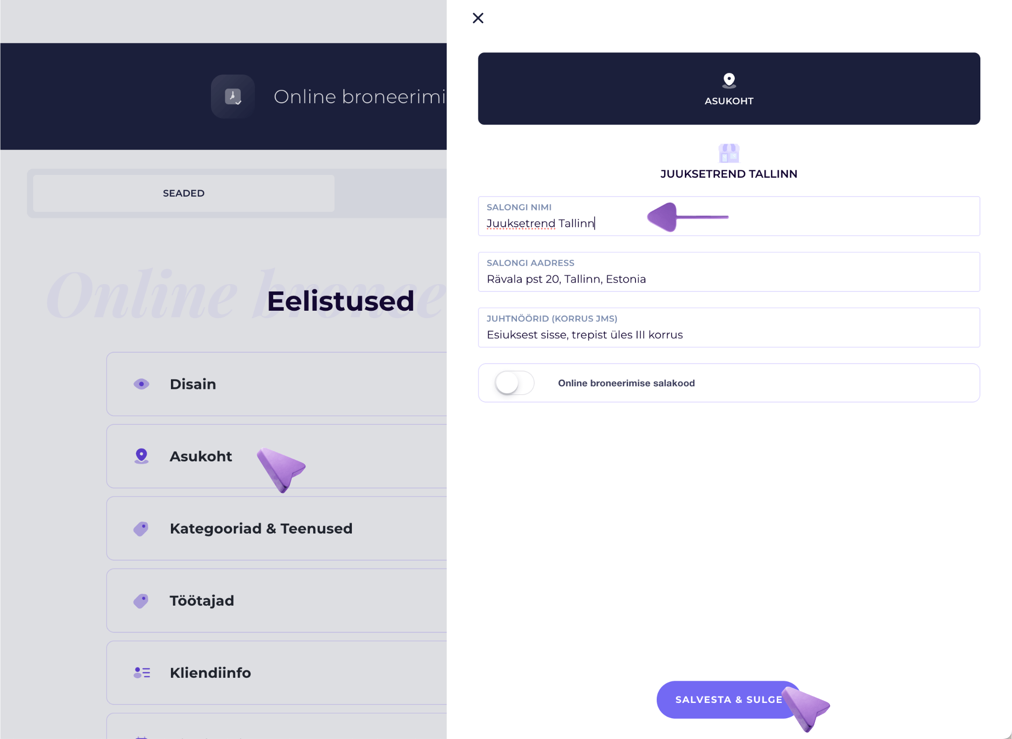 Online broneerimises kuvatavat salongi nime tuleks soovi korral muuta ka lehelt Rakendused -> Online broneerimine -> Eelistused -> Asukoht.