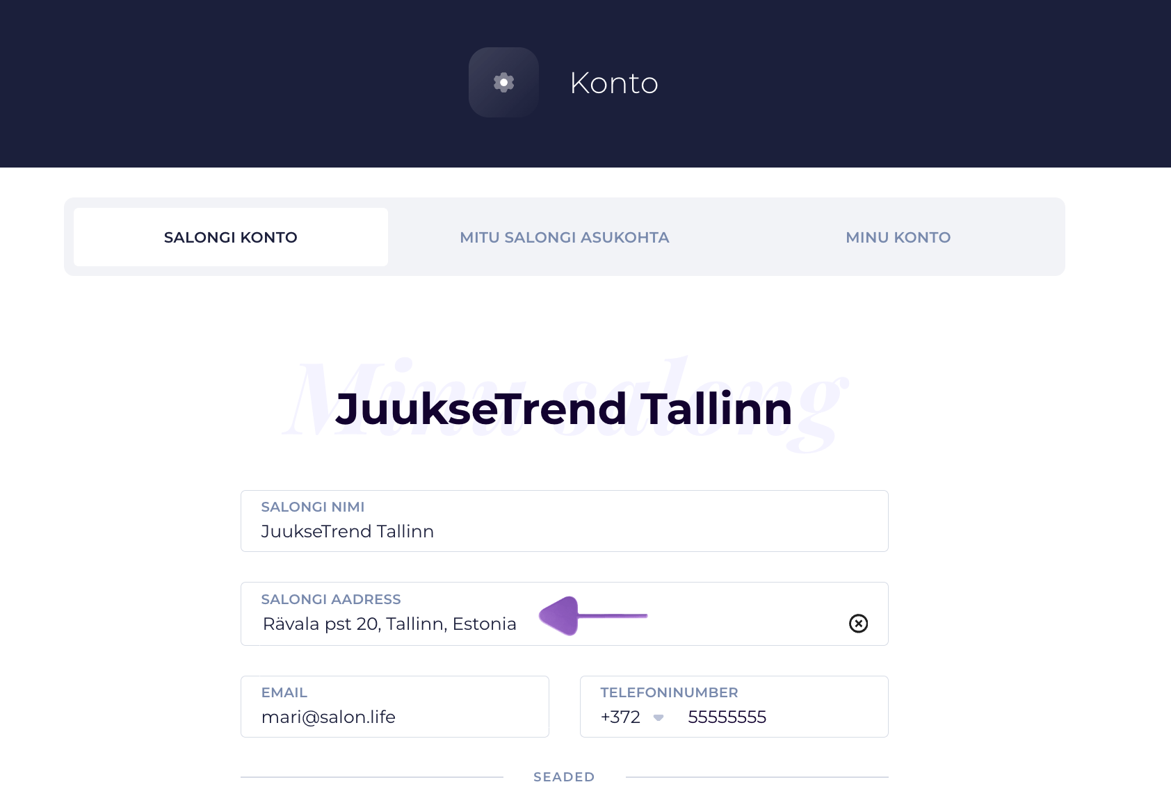 Salongi nime ja muid salongi andmeid saad muuta kui valid Rakendused -> Konto & seaded.