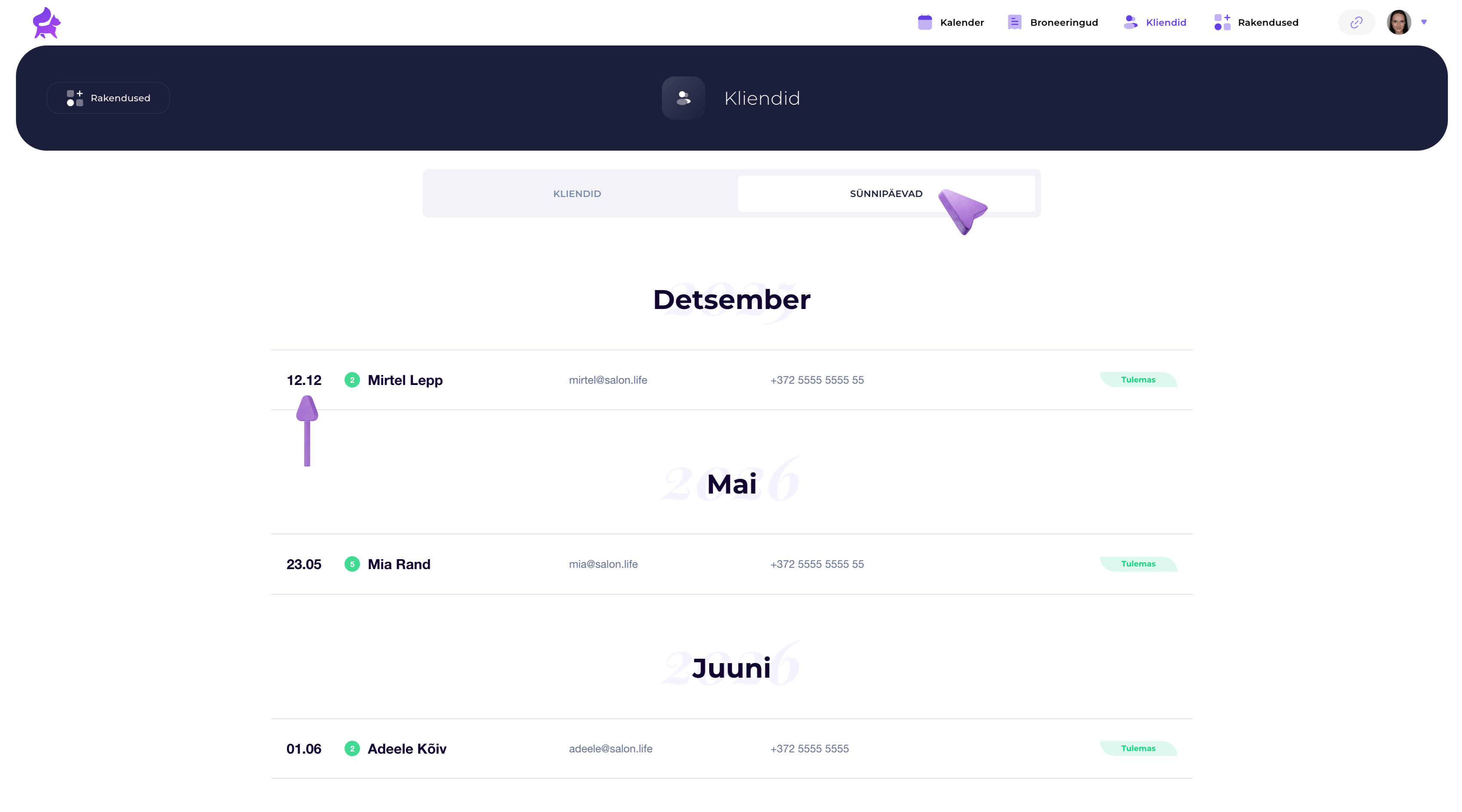 SĂŒnnipĂ€evade nimekiri: Kui kliendi sĂŒnnipĂ€ev on sĂŒsteemi sisestatud, nĂ€ed neid automaatselt SĂŒnnipĂ€evad nimekirjas. Sealt saad kiire ĂŒlevaate, kes tĂ€histab sĂŒnnipĂ€eva kĂ€esoleval kuul vĂ”i lĂ€hikuudel.