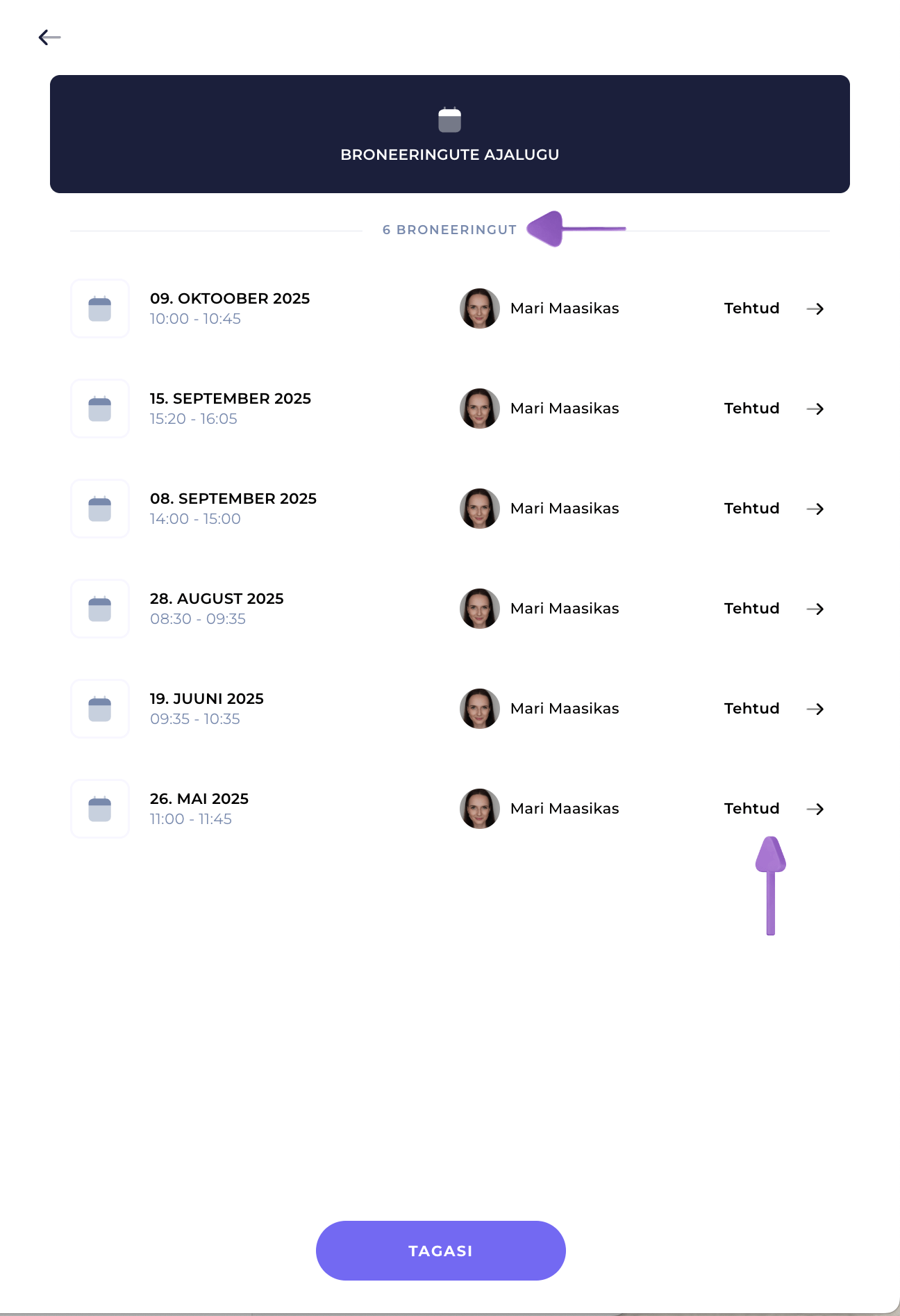 Broneeringute ajaloo nimekirjast üleval näed broneeringute arvu, mis näitab selle kliendi kõigi broneeringute koguarvu (nii minevikus toimunud kui ka tulevikus planeeritud). Kliendi profiilil avaneb täiendav broneeringute ajalugu:
