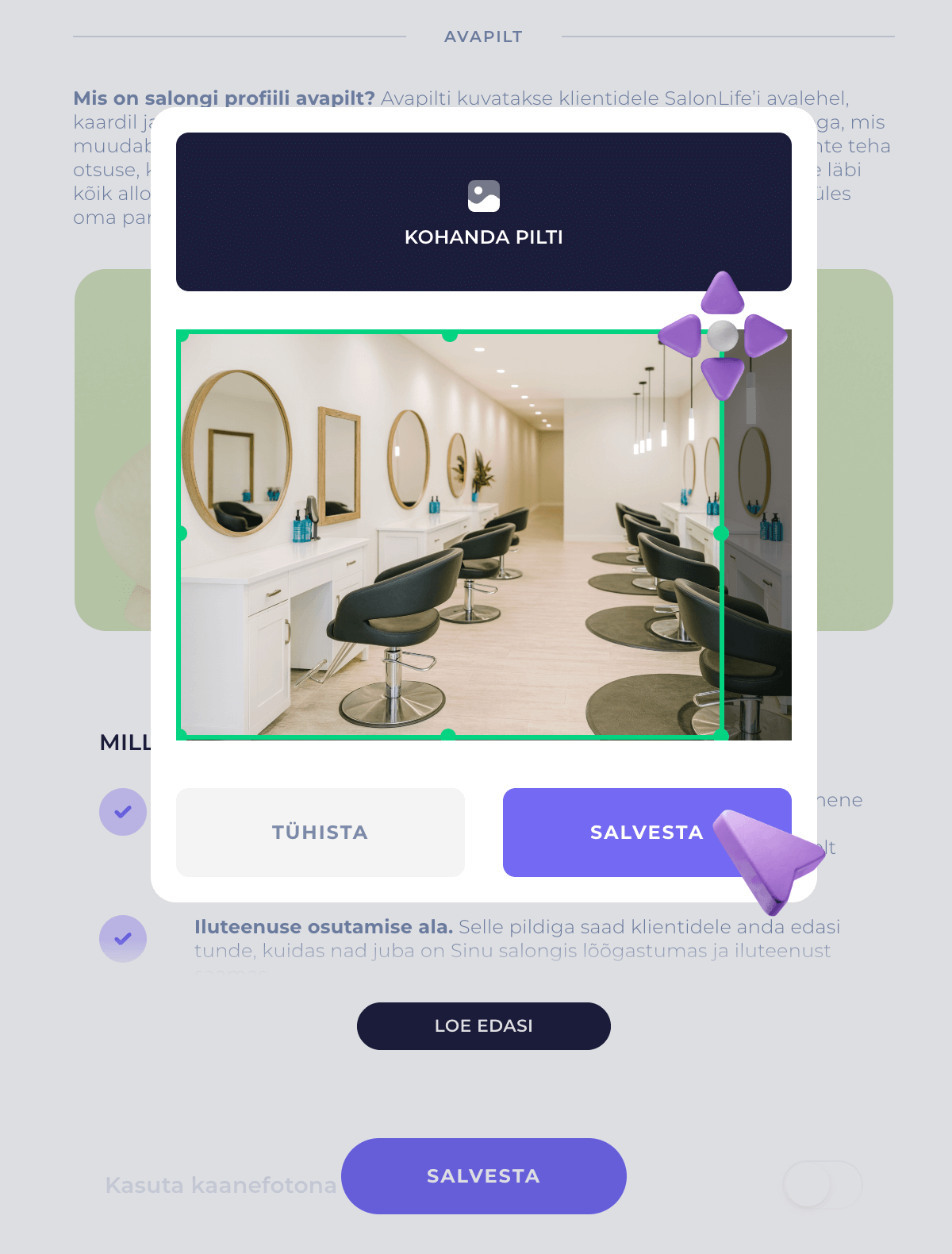 PĂ€rast piltide ĂŒleslaadimist saad mĂ€rkida, milliseid ilukategooriaid ja -teenuseid sa oma klientidele pakud. Samal lehel vali kindlasti ka teised lisahĂŒved vĂ”i mugavused, mida su salongis leidub, nĂ€iteks: