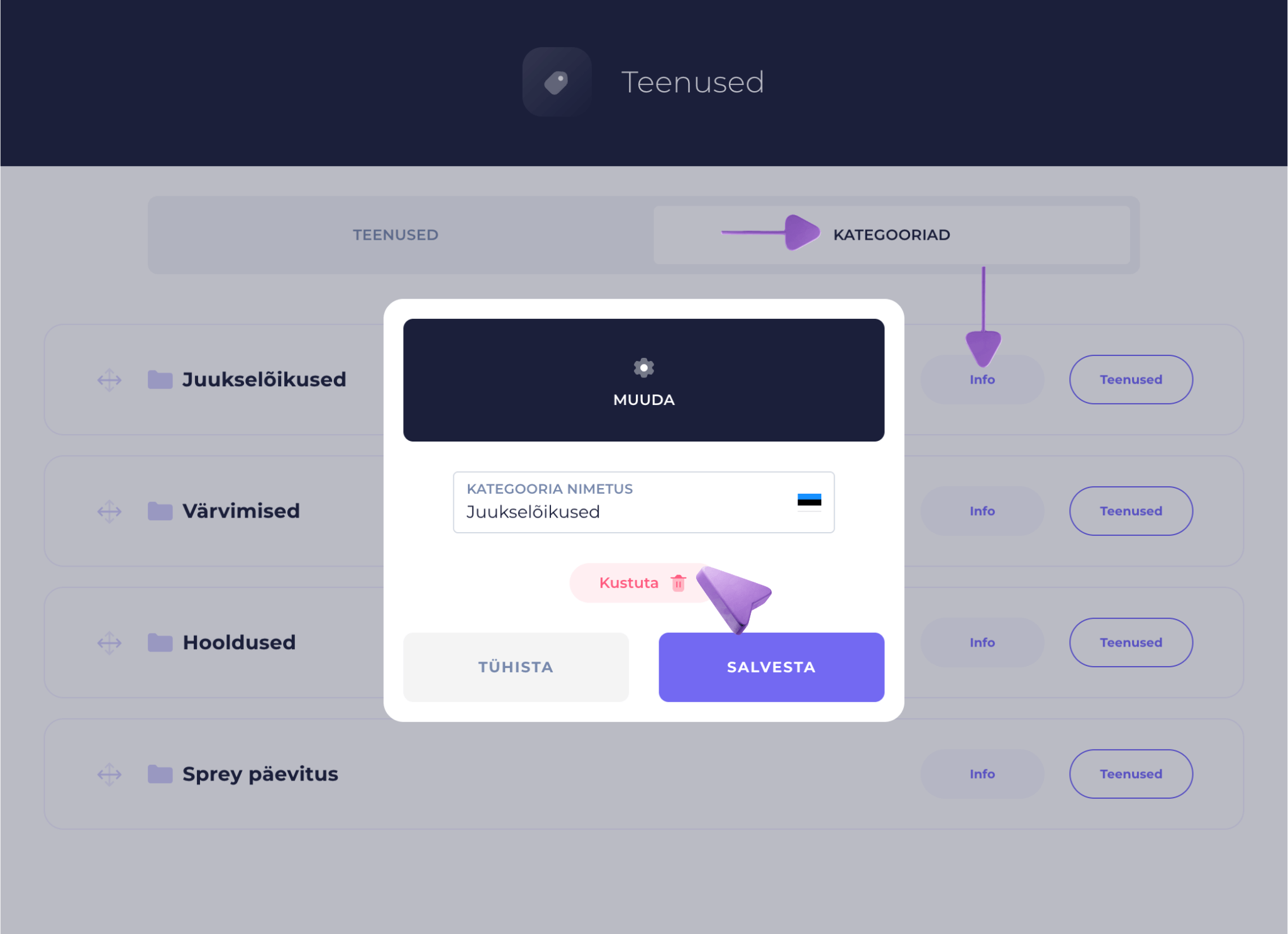 Teenuste kategooriad aitavad hoida sinu teenuste valiku selge ja loogilisena, et kliendid leiaksid broneerimisel otsitavad teenused kiiresti üles. Kui mõnda kategooriat enam ei ole vaja, saad selle hõlpsalt kustutada. Allpool leiad samm-sammulised juhised, kuidas seda teha.