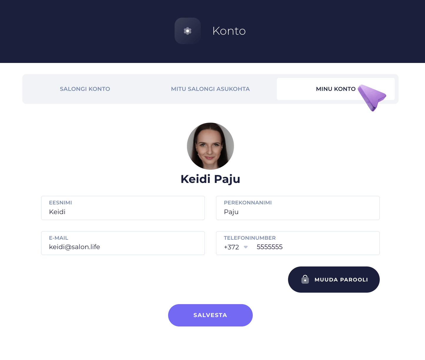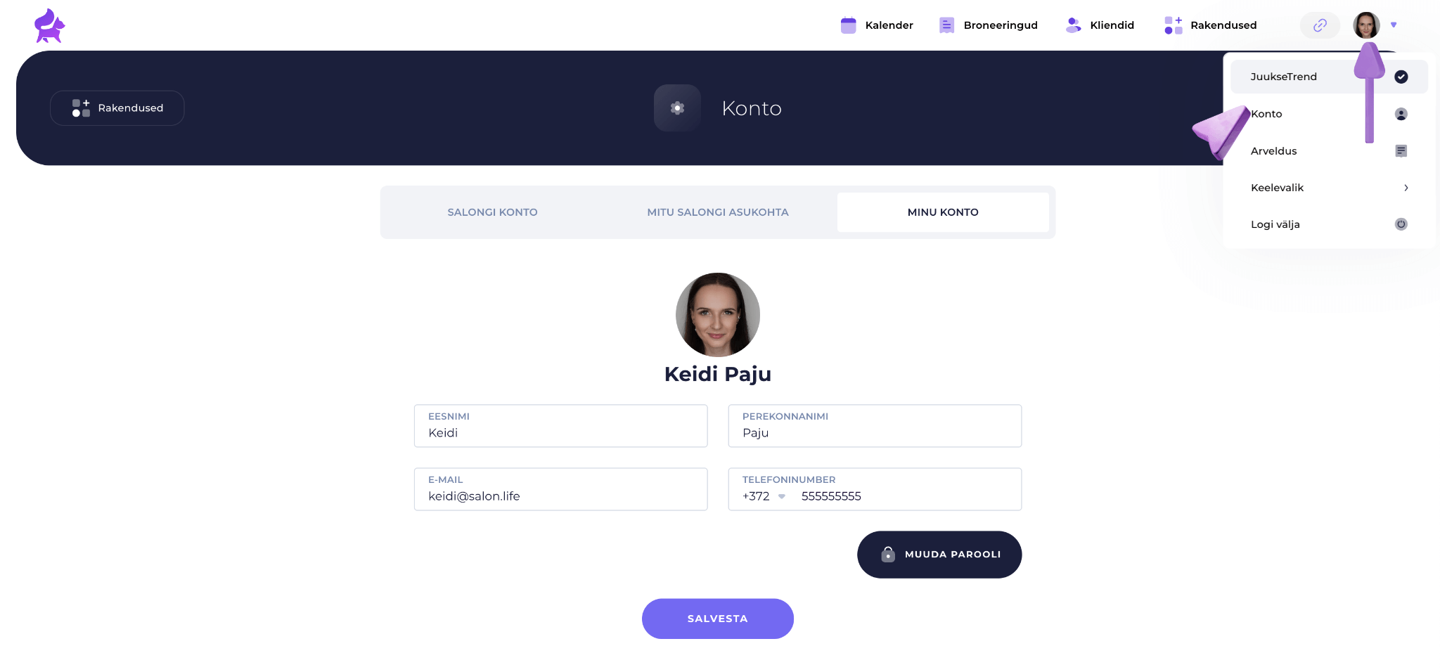 Oma SalonLife'i konto seadeid, näiteks nagu email, parool, ees ja perekonna nimi saad muuta lehelt Rakendused -> Konto & seaded -> Minu konto või alloleval pildil nähtavate juhiste järgi.