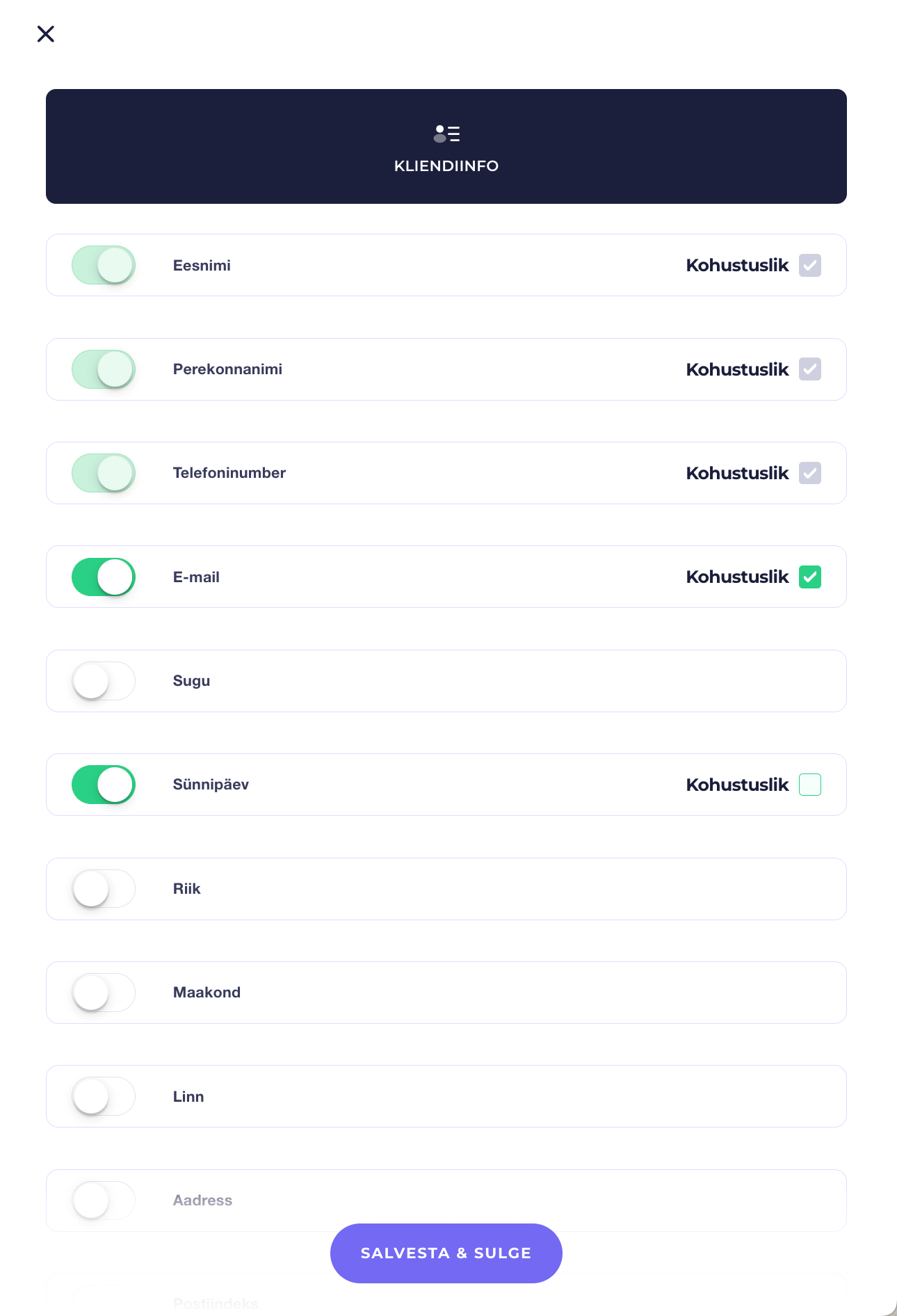 Kliendivorm - Aktiveeri vĂ”i peida andmete vĂ€lju vastavalt salongi soovidele. - Tee osa vĂ€ljadest kohustuslikuks (nt telefoninumber, e-post), et saada kindlasti vajalik info. - Soovi korral saab kasutada lisavĂ€lju (nt âLisainfoâ vĂ”i âSĂŒnnipĂ€evâ).