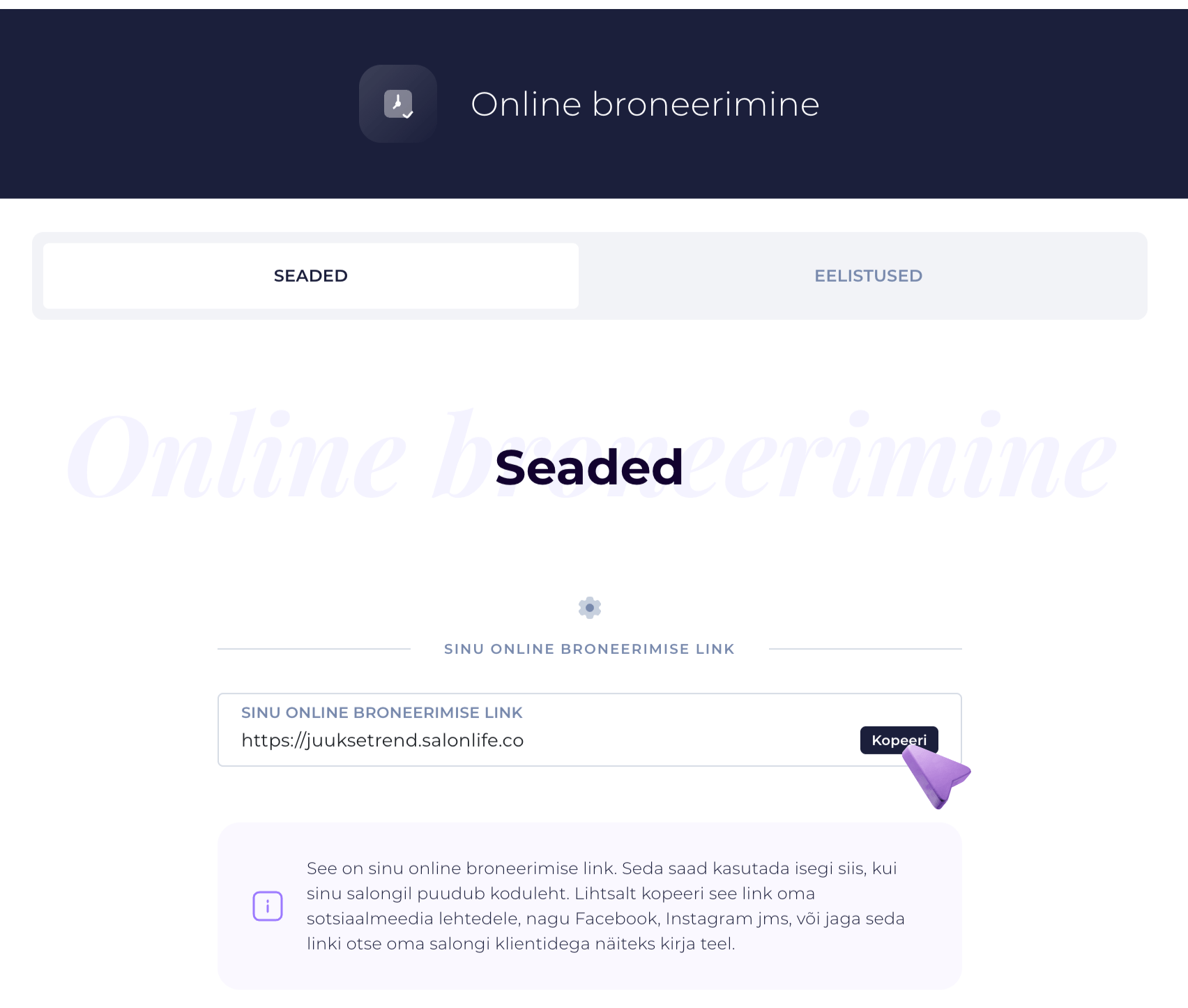 - Leiad oma salongi online broneerimise lingi kui lÀhed Rakenduste lehelt Online broneerimine alalehele.